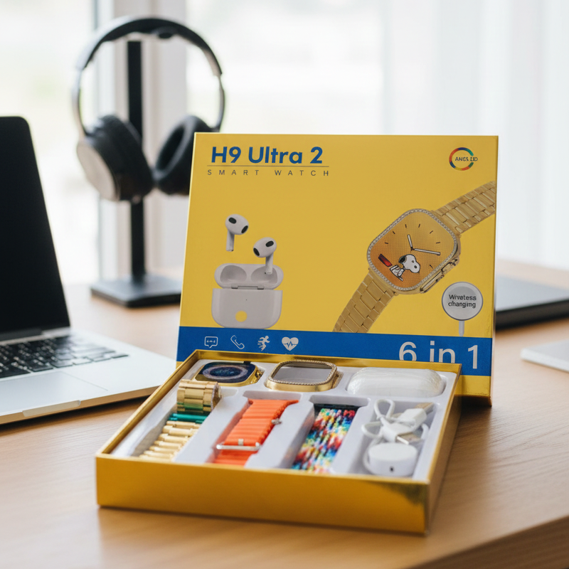 The H9 Ultra 2 Smart Watch – 6‑in‑1 Set delivers advanced technology and stylish design in one package. Featuring an original full display, this smartwatch offers clear visuals and smooth performance. The set includes AirPods 3 Model BT for wireless audio, a protective watch cover, and multiple straps for versatile styling. Perfect for fitness tracking, connectivity, and everyday use, this bundle combines functionality, comfort, and modern design.